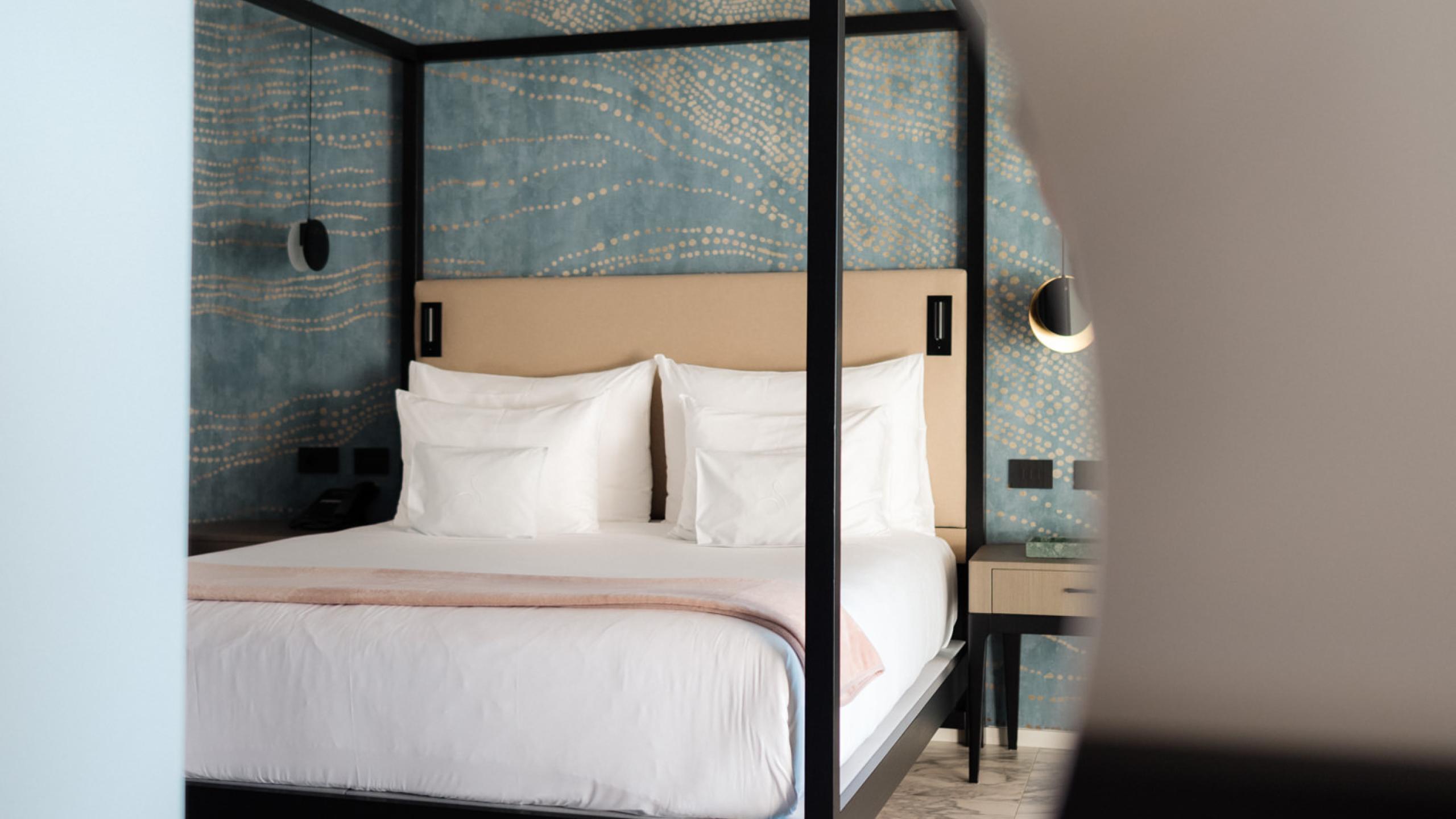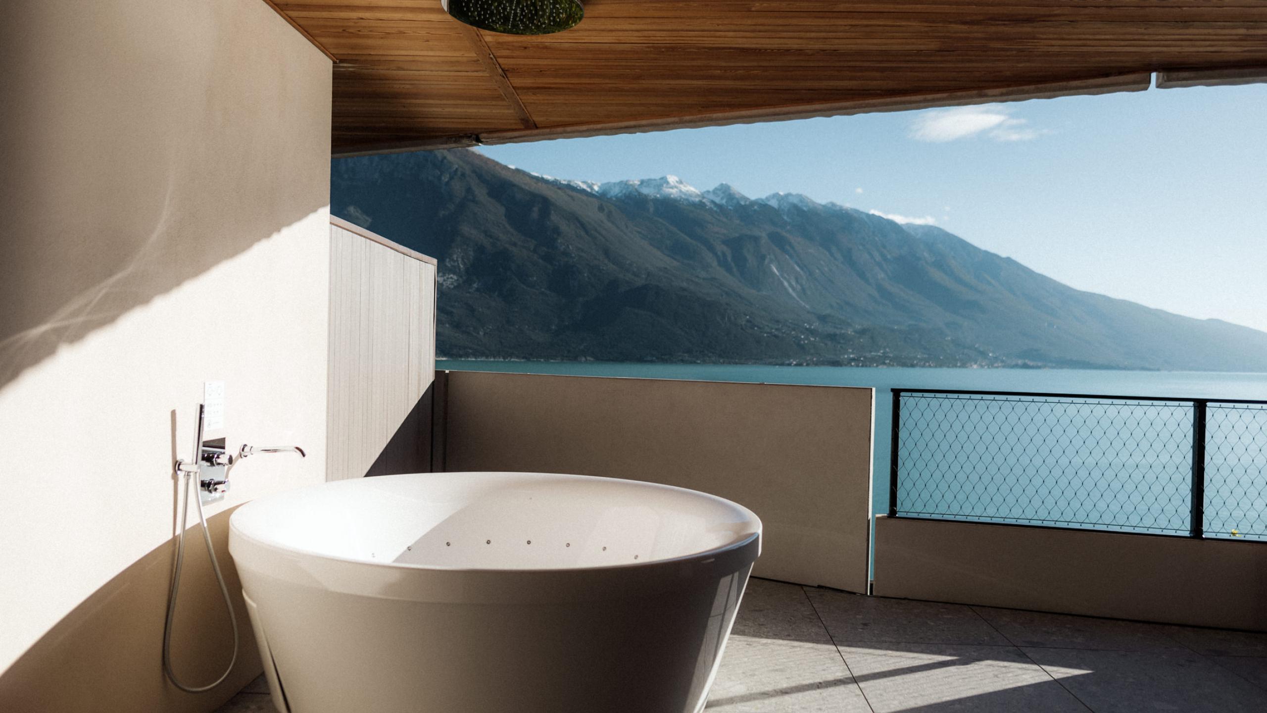 Hellblaues Interieur, Himmelbett und Airpool auf der Terrasse mit wunderschönem Seeblick. Die perfekte Kombination aus HImmel und See.