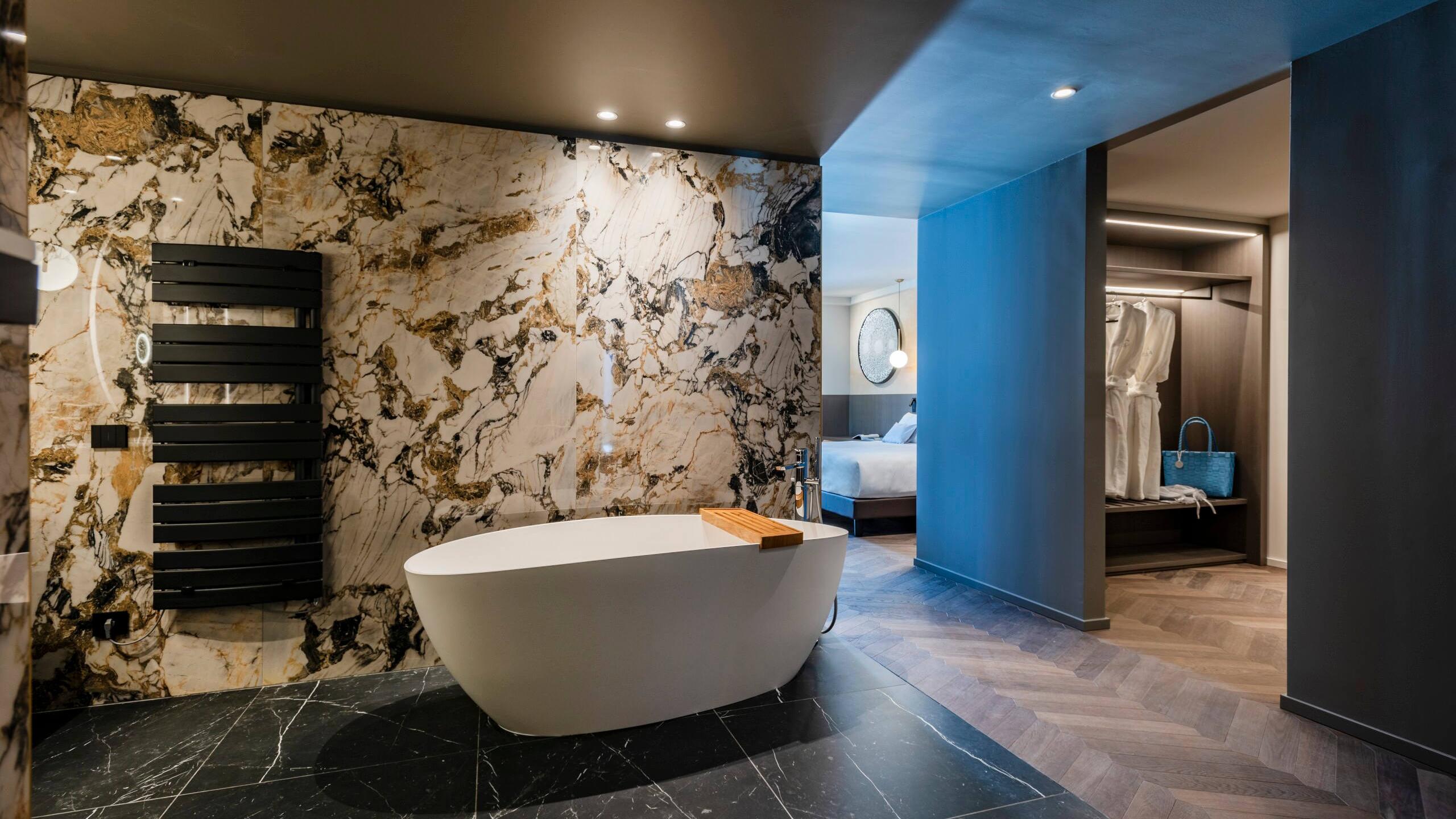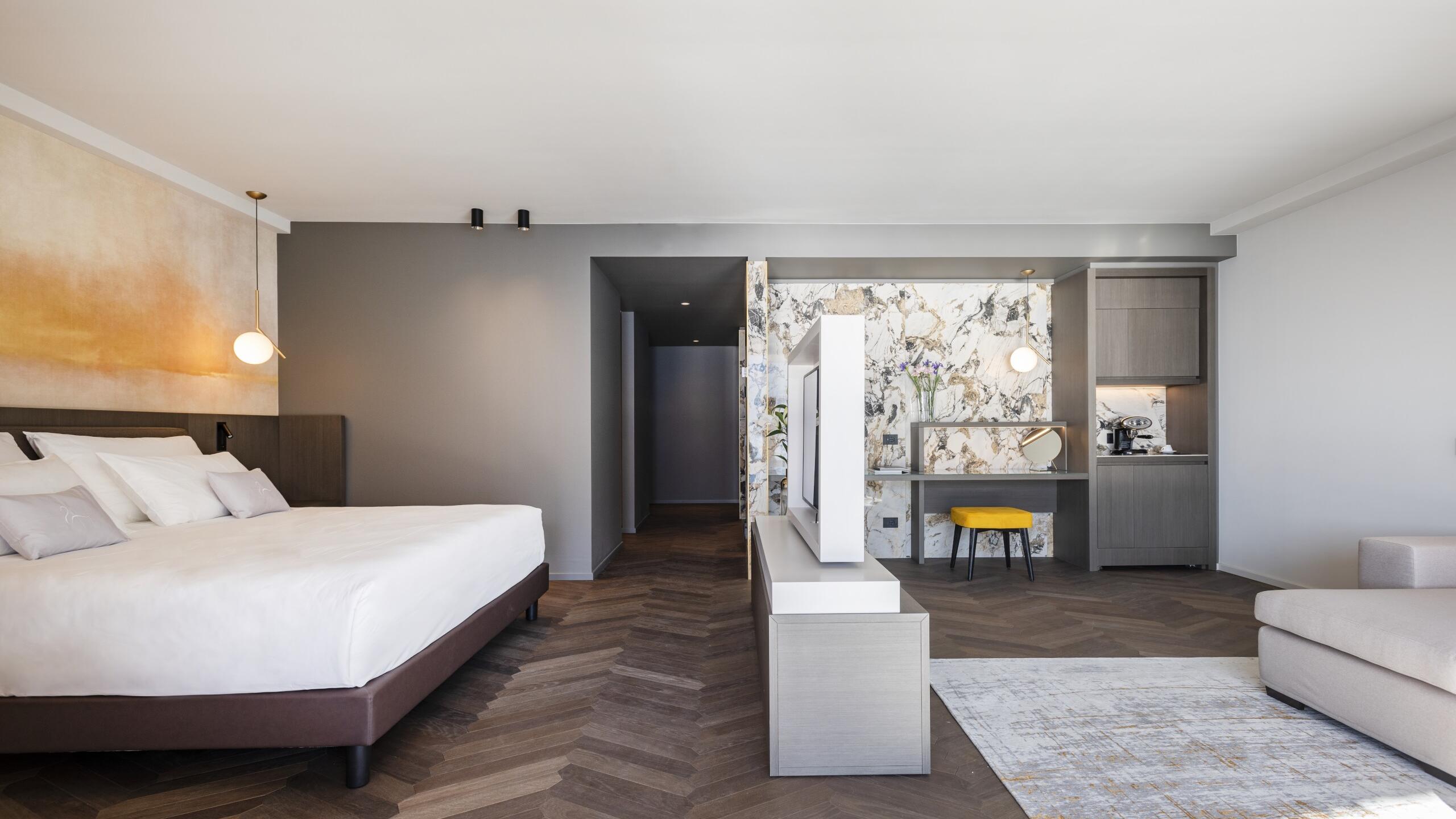 The elegance of marble dominates the interiors of this Suite. In the Airpool on the lake view terrace, you can set your spirit free.