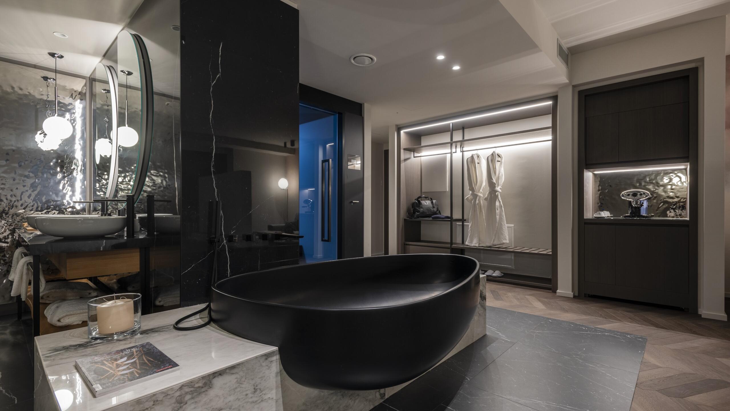 - Bagno open space con vasca sospesa e bagno turco con doccia integrata